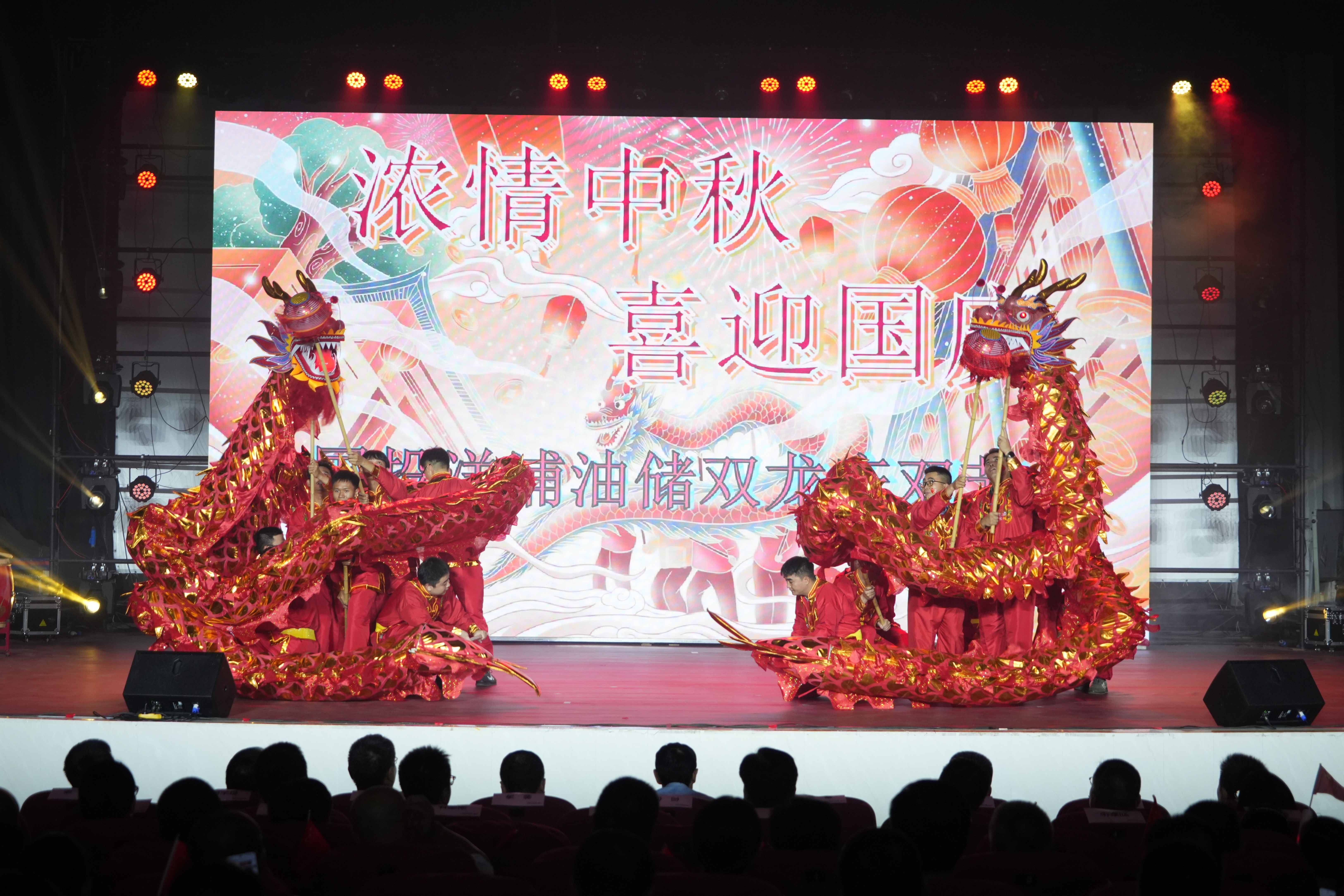 晚会在气势恢宏的开场舞龙《双龙贺双节》中磅礴启幕。国投油储的同事们以矫健的身姿和铿锵的鼓点,舞出了国投人昂扬向上的精神风貌,瞬间点燃全场热情。