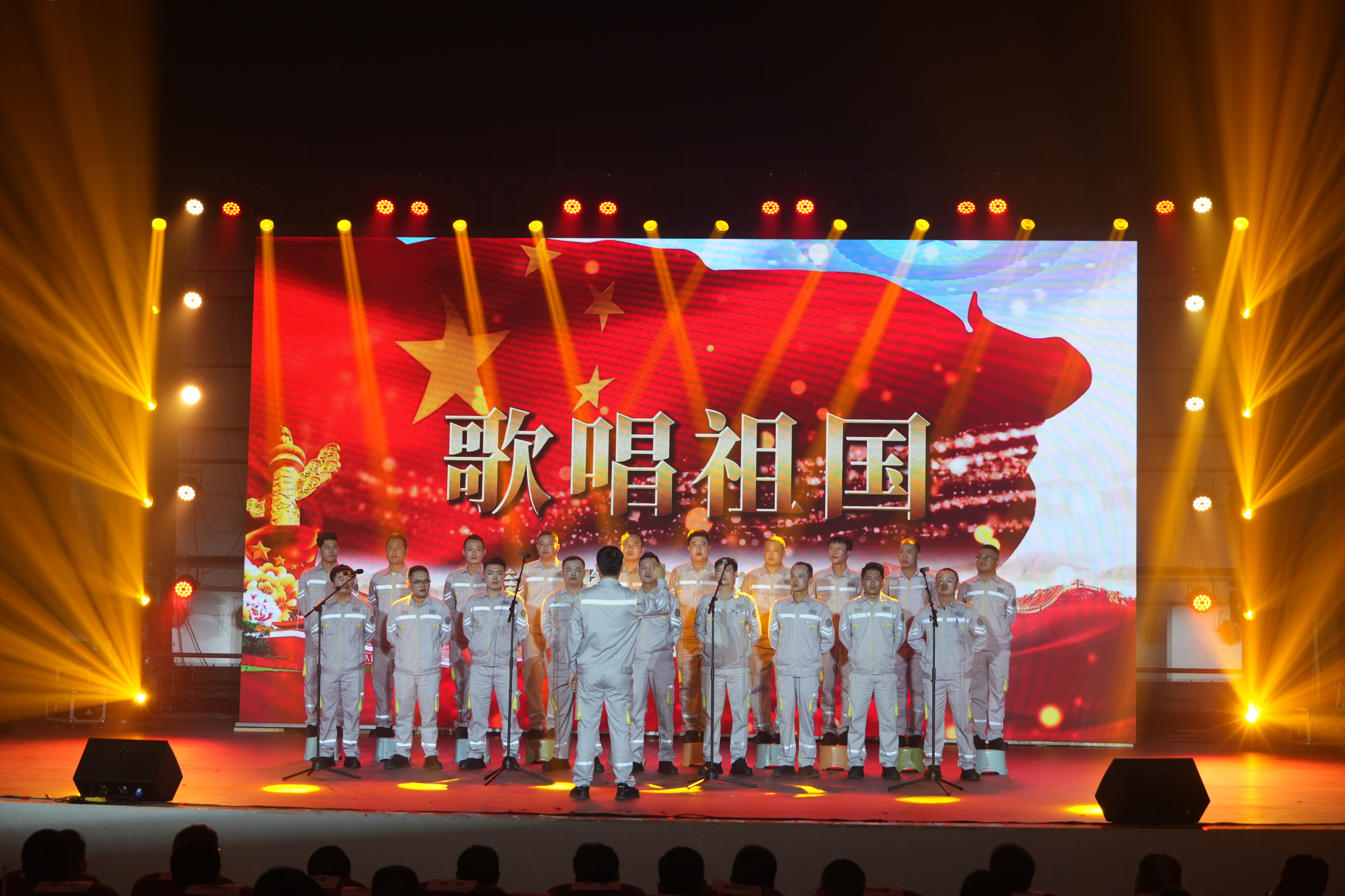 国投洋浦港一线员工激昂雄壮的大合唱《歌唱祖国》将晚会推向高潮,抒发了全体国投人对祖国的深厚情感与美好祝愿。